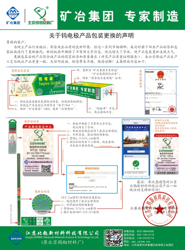 關于鎢電極產品包裝更換的聲明